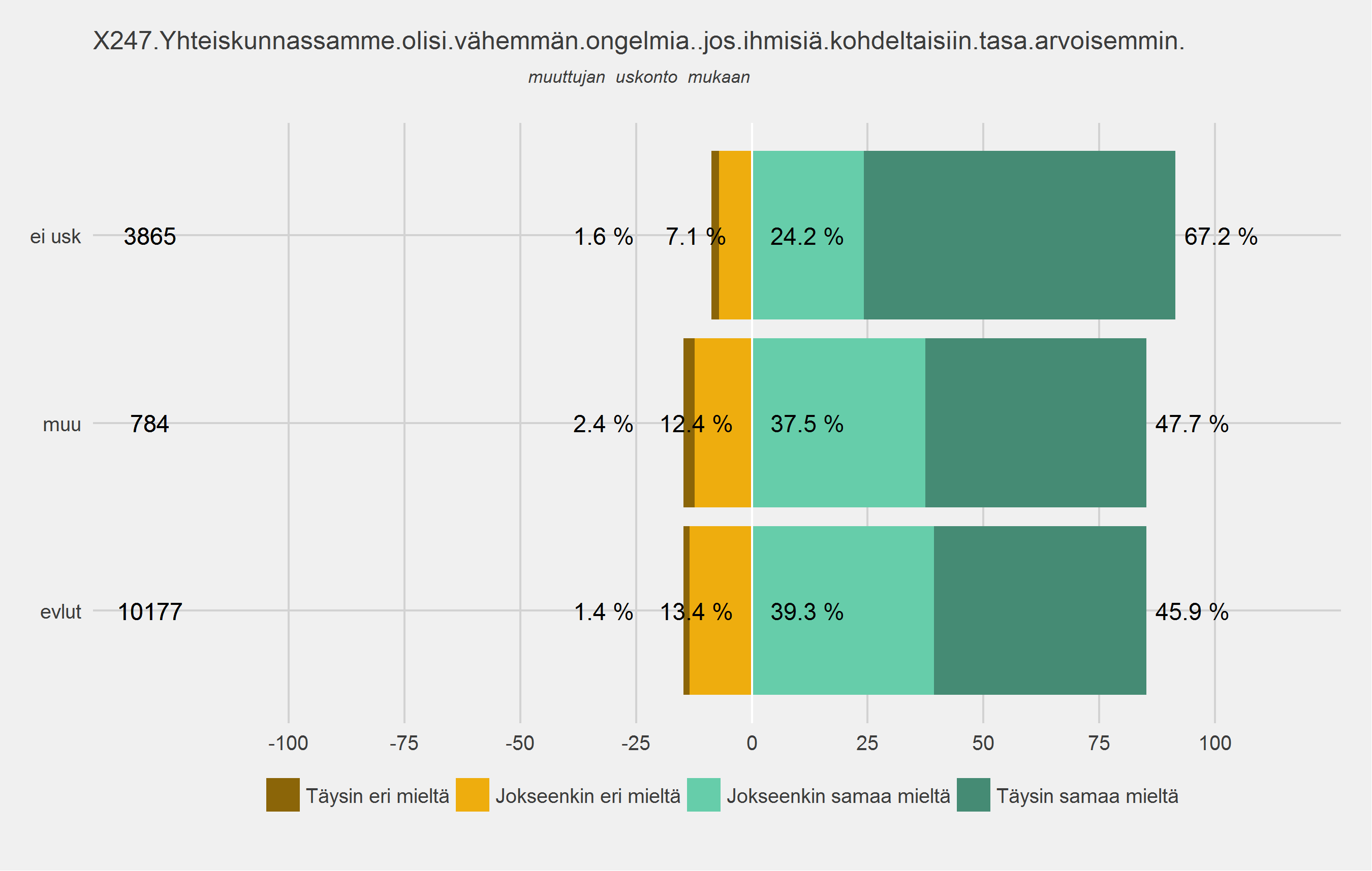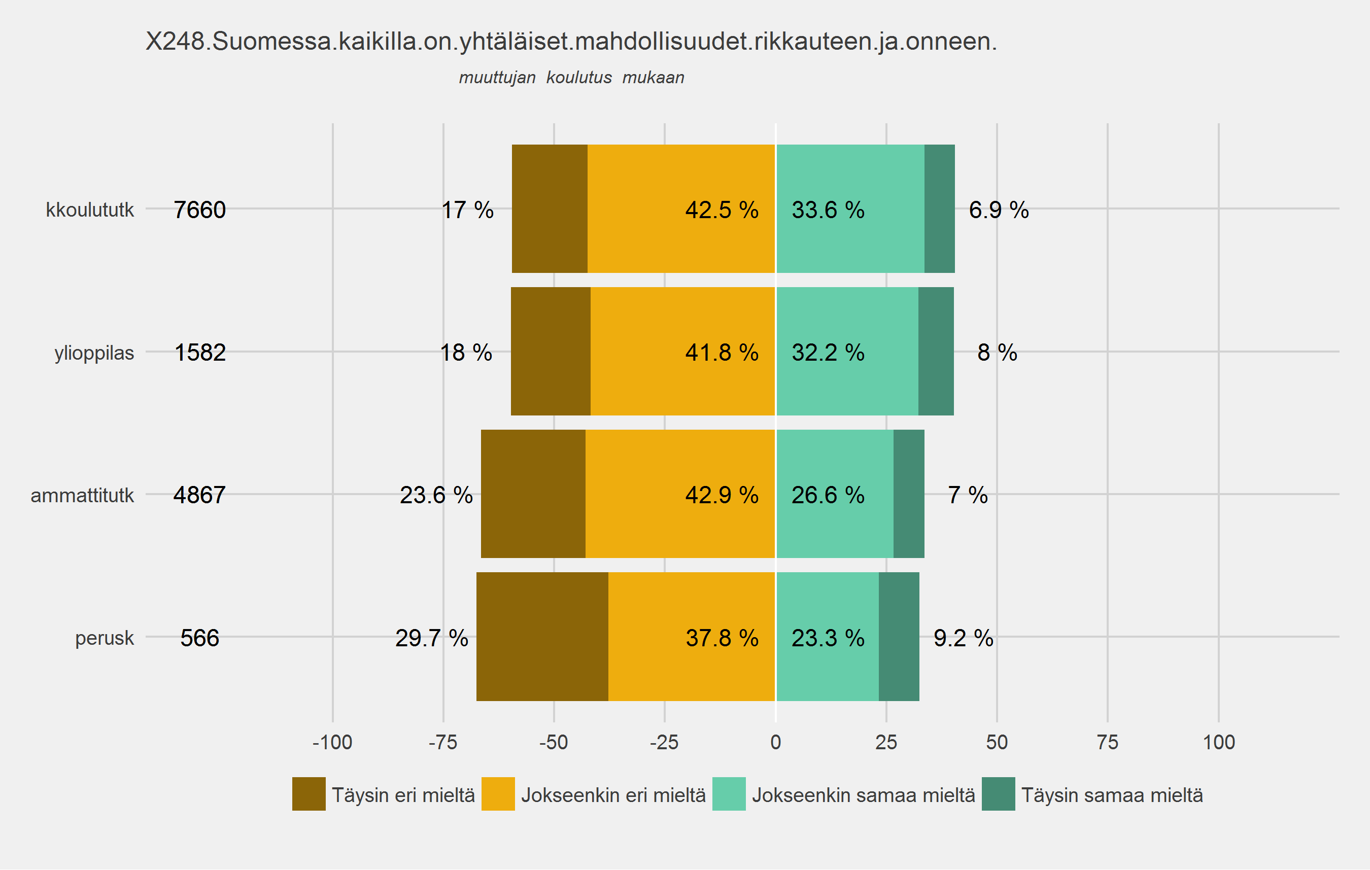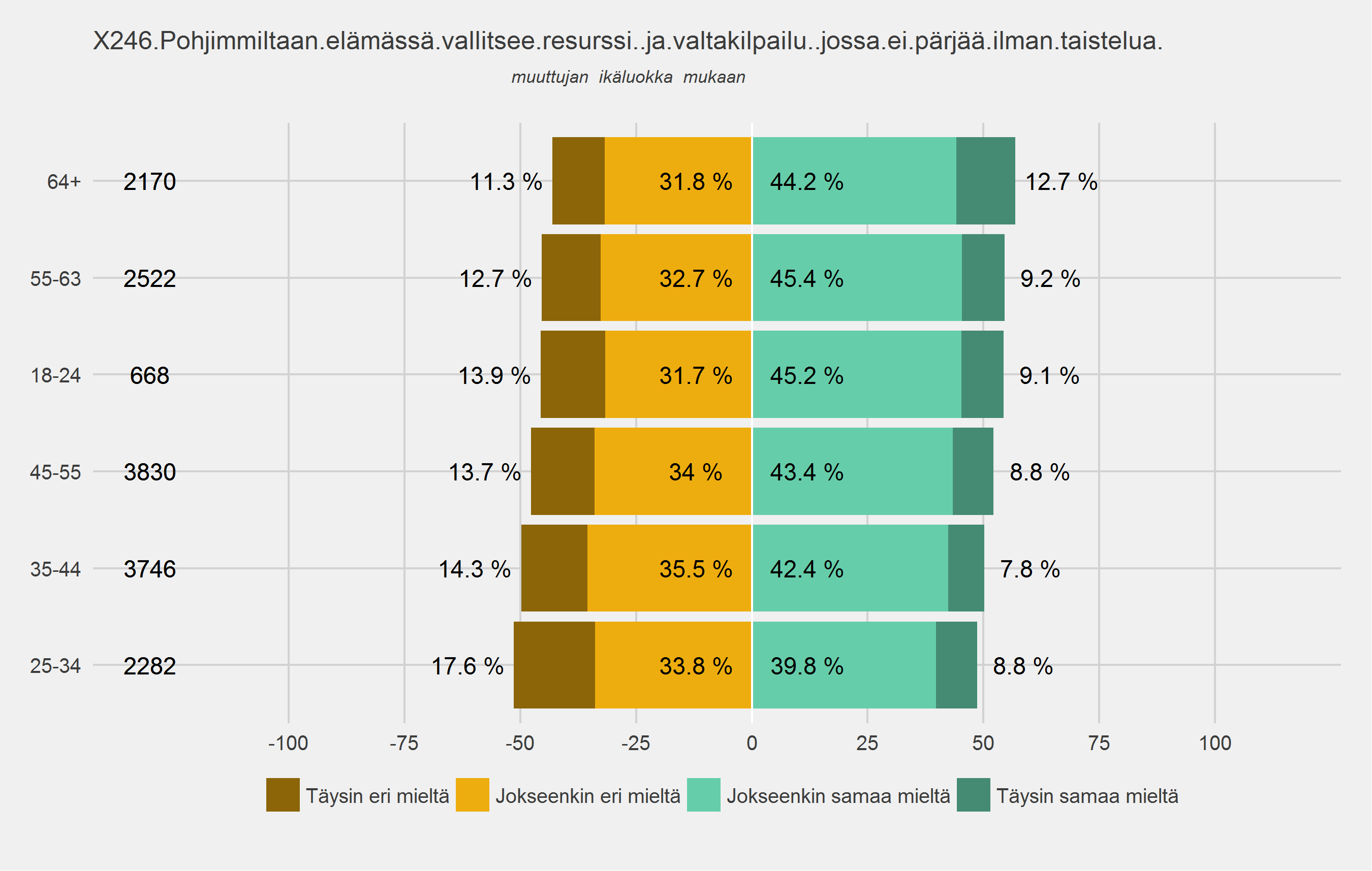 Vain kysymyksessä 6 (yhtäläiset mahdollisuudet) erot ovat selviä: ikäryhmät ovat sitä vähemmän samaa mieltä kaikkien yhtäläisistä mahdollisuuksista mitä vanhempia he ovat. Mutta ajattelevatko vanhukset omia mahdollisuuksiaan joita heillä ei ollut nuorempina, nykyisten nuorten mahdollisuuksia nyky-Suomessa joita pitävät huonompina kuin omiaan aikoinaan, vai nykyisiä omia mahdollisuuksiaan maassa jossa vanhuksilla on (omasta mielestään) yhä huonompi olla?