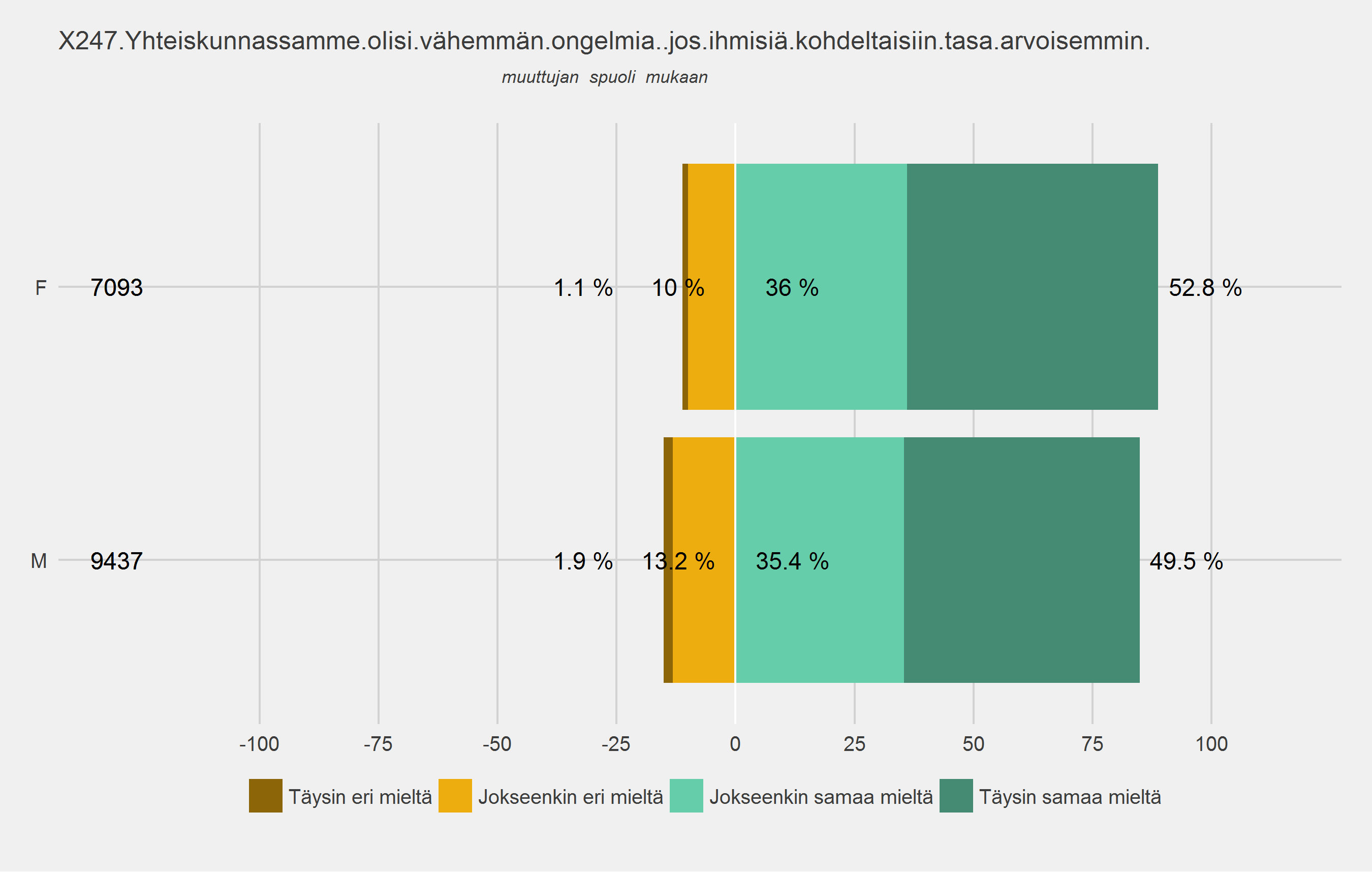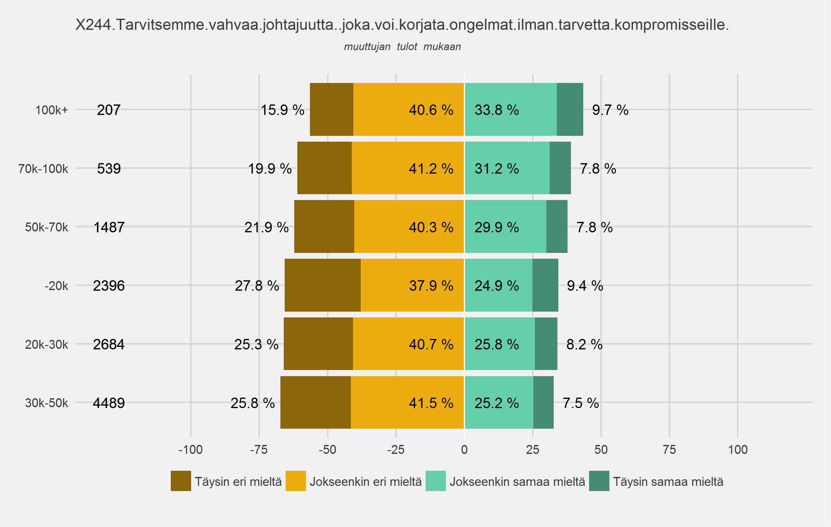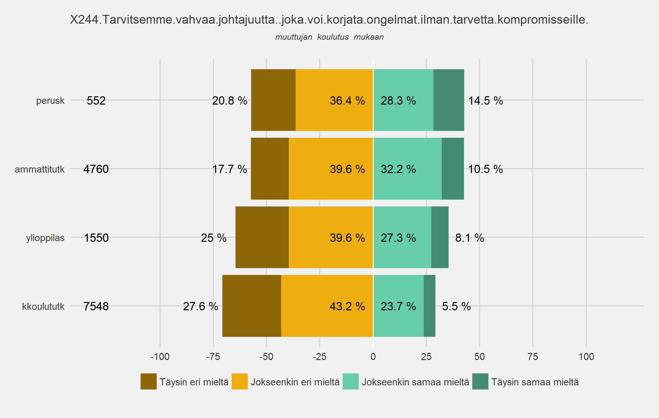 Sukupuolista odotin, että naisehdokkaat olisivat selvemmin tasa-arvon lisäämisen kannalla, mutta erot ovat melko mitättömiä. Sen sijaan miesehdokkaat kaipaavat selvästi enemmän vahvaa johtajaa sekä pitävät elämää taisteluna ja Suomea yhtäläisten mahdollisuuksien maana. Maailmalla miehet ovat olleet enemmän populististen liikkeiden kannalla, mikä sopii johtajuuskysymykseen. Yhtäläisten mahdollisuuksien kohdalla taitaa näkyä sukupuoliero työnantajasektorien suhteen.