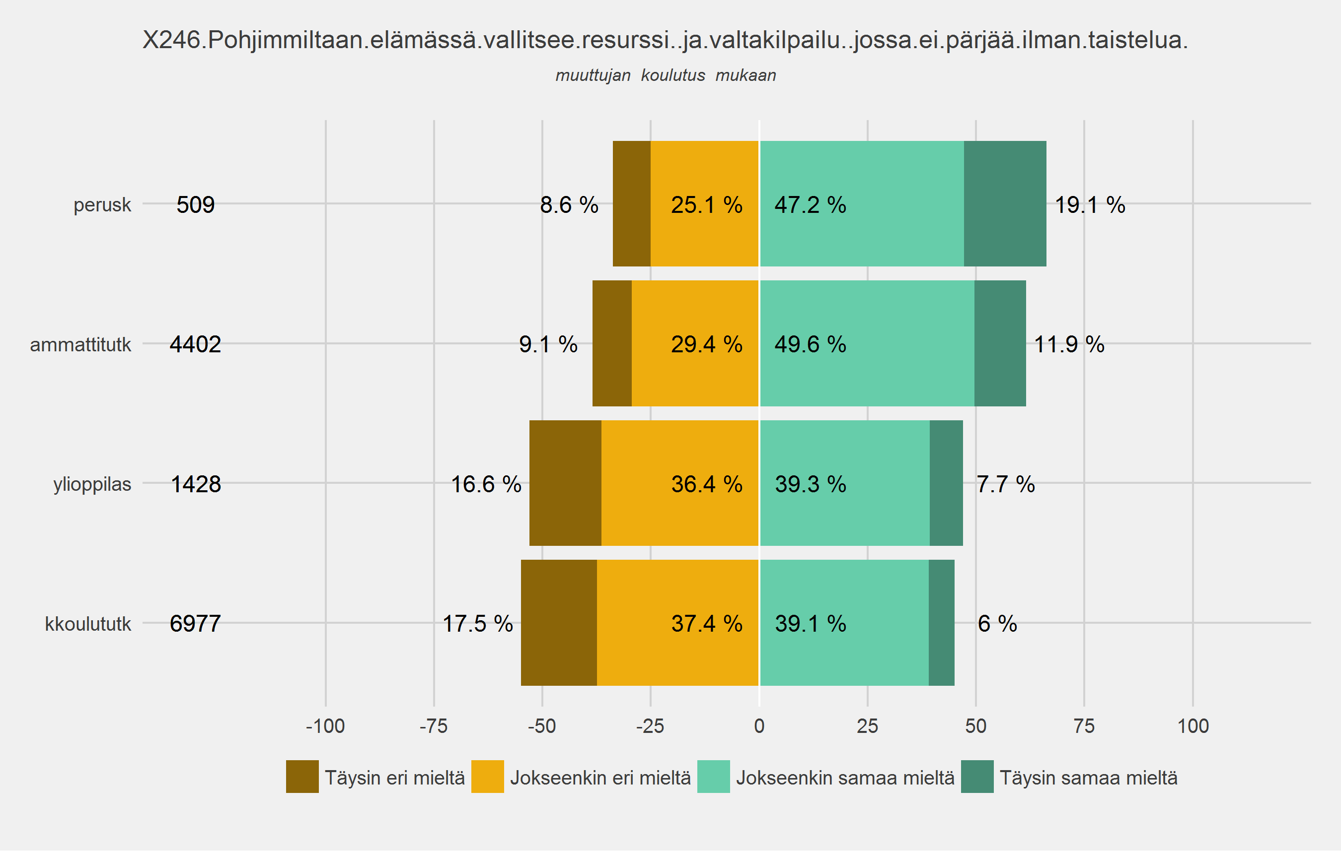 Koulutuksessa erot ovat selkeämpiä, ja menevät kauttaaltaan suunnilleen koulutuksen määrän suuntaisesti (lähinnä toisen asteen koulutustasot, ammattitutkinto ja ylioppilas, vaihtavat keskenään paikkaa). Koulutetummat kaipaavat vähemmän menneeseen ja vahvaa johtajuutta, pitävät elämää vähemmän taisteluna ja lapsilla tärkeämpinä uteliaisuutta ja itsenäisyyttä, ja ovat enemmän sitä mieltä että Suomessa kaikilla on yhtäläiset mahdollisuudet. Vain tasa-arvon suhteen vastausosuudet ovat käytännössä samat. Yhdysvalloissa, missä eroa liberaali-konservatiivi ja vasemmisto-oikeisto -akselien välillä ei usein tehdä vaan liberaalia pidetään yleensä myös vasemmistolaisena, yliopistokoulutus on tyypillisesti yhteydessä liberaaliuteen/vasemmistolaisuuteen. Tässä datassa kuitenkin samaa yhteyttä vasemmistolaisuuteen ei voida suoraan havaita, kun katsotaan kysymyksiä tasa-arvosta ja yhtäläisistä mahdollisuuksista ja verrataan puolueiden vastausosuuksiin.