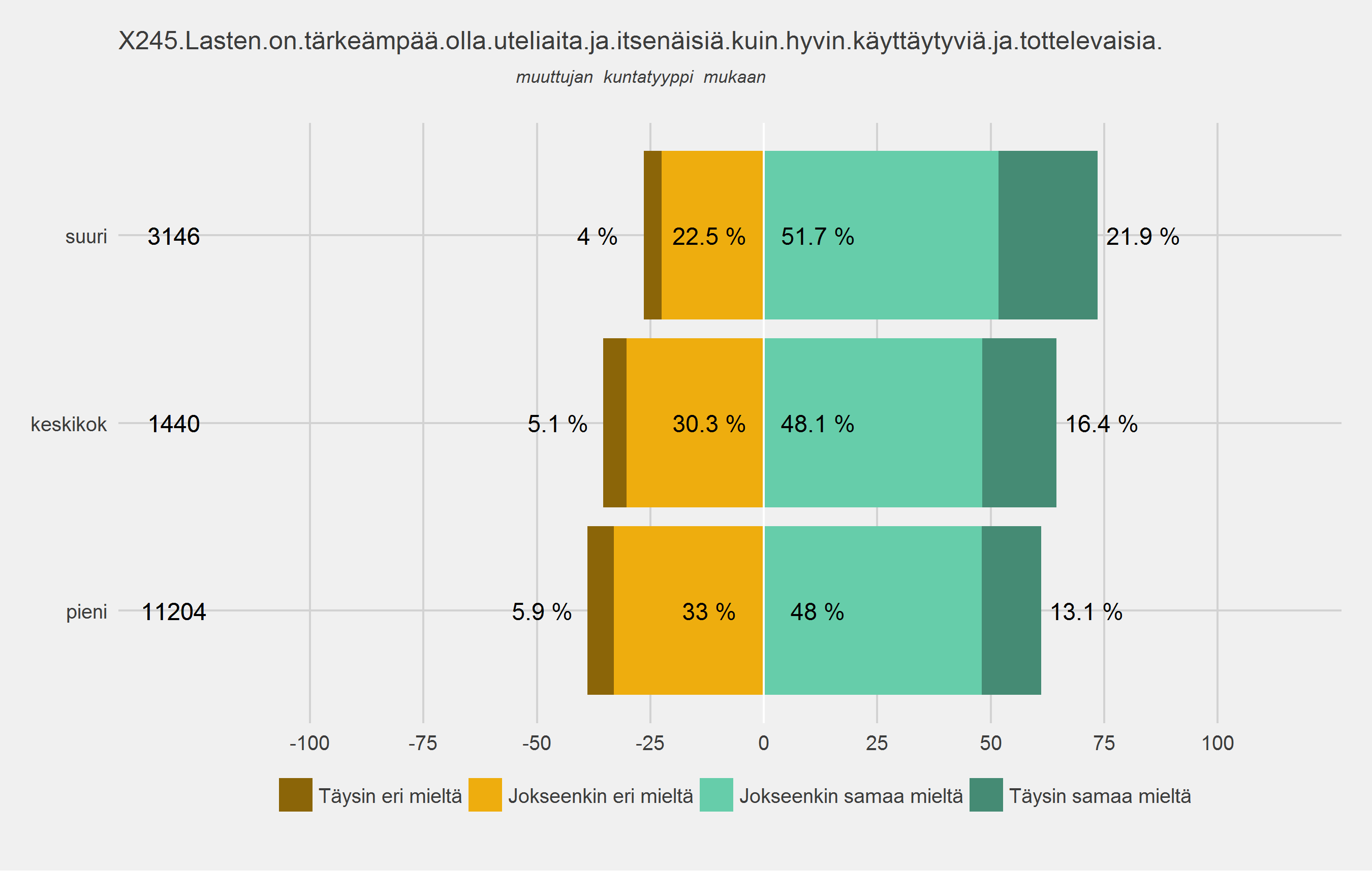 Jaoin kunnat suuriin, keskikokoisiin ja pieniin, sillä taka-ajatuksella että saisinko näkyviin Trumpin ja Brexitin yhteydessä esitetyn eron suurten kaupunkien, kuihtuvien teollisuuskaupunkien ja maaseudun välillä. Kuntatyyppien erot ovatkin näkyvillä (n. 10 %-yksikköä) lähinnä kysymyksissä johtajuudesta, lasten ominaisuuksista ja elämän kilpailullisuudesta, joista kaksi ensimmäistä on yhdistetty muualla populistisiin liikkeisiin, ja joista jälkimmäinen oli edellisessä vertailussani vahvasti Perussuomalaiset erottavin kysymys.