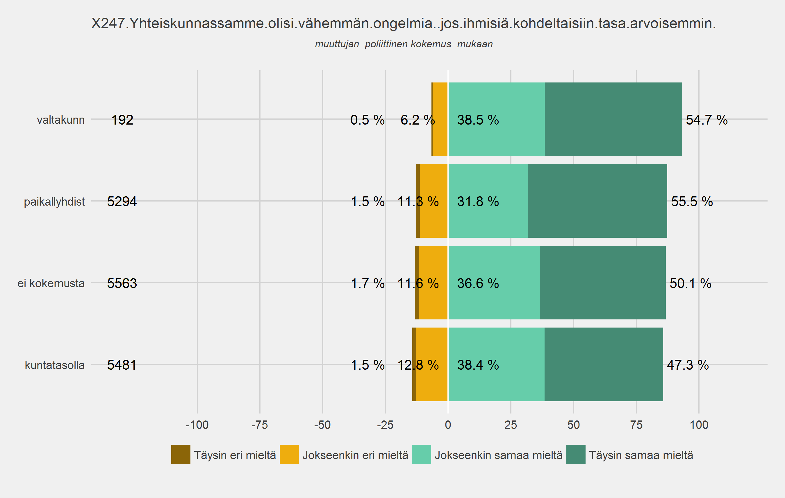 Ja valtakunnalliset poliitikot (kansanedustaja- tai meppikokemusta) ovatkin eniten erillään muista. He ovat liberaalimpia (vähemmän kaipuuta entiseen), vähemmän populistisia (enemmän eri mieltä vahvasta johtajasta ja elämän kilpailullisuudesta kuin muut – lasten ominaisuuksien kohdalla tosin ero on pienempi), ja pitävät tasa-arvon lisäämistä useammin hyvänä asiana. Yhtäläisten mahdollisuuksien suhteen kokonaisosuudet eri ja samaa mieltä olevien välillä eivät eroa, mutta valtakunnallisista poliitikoista harvempi on selvästi eri mieltä.