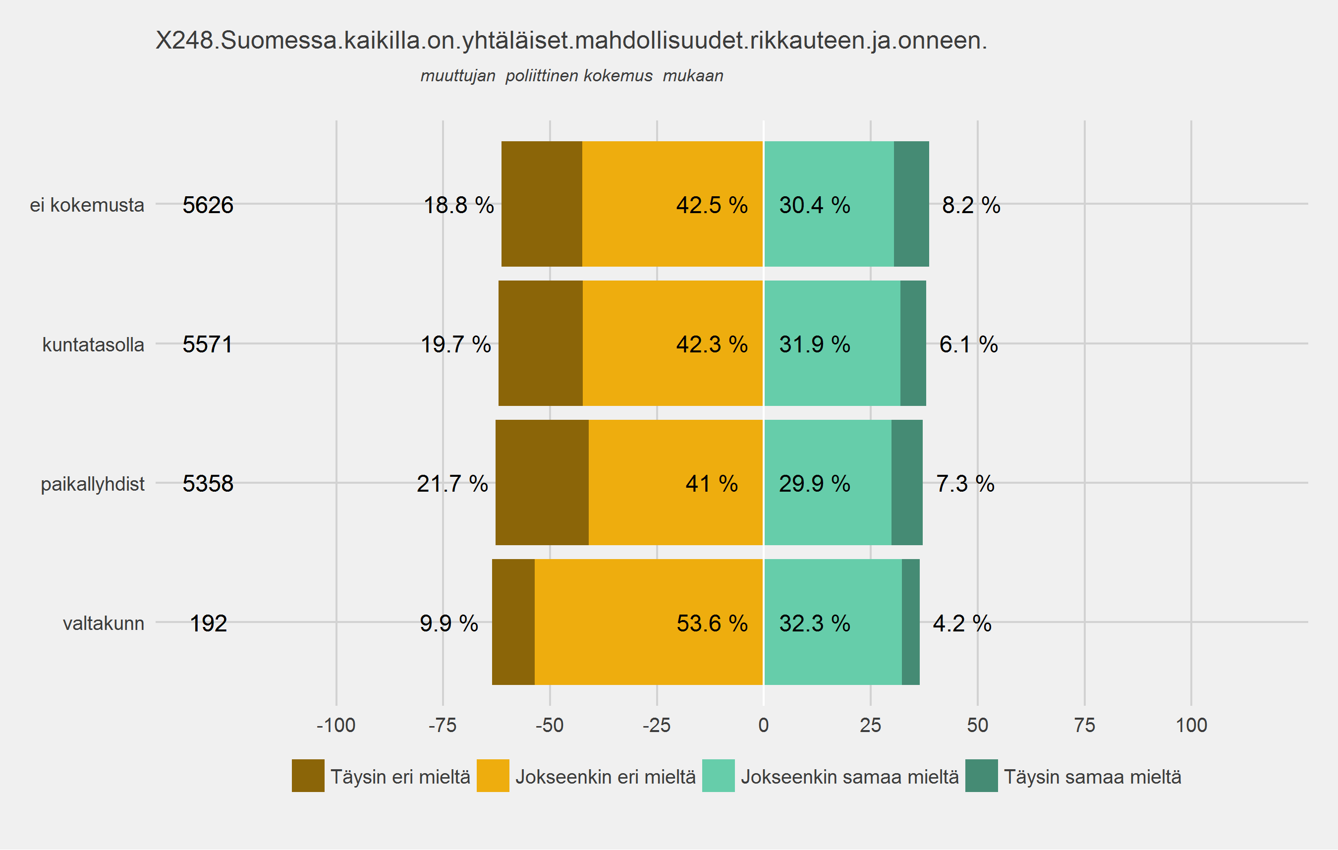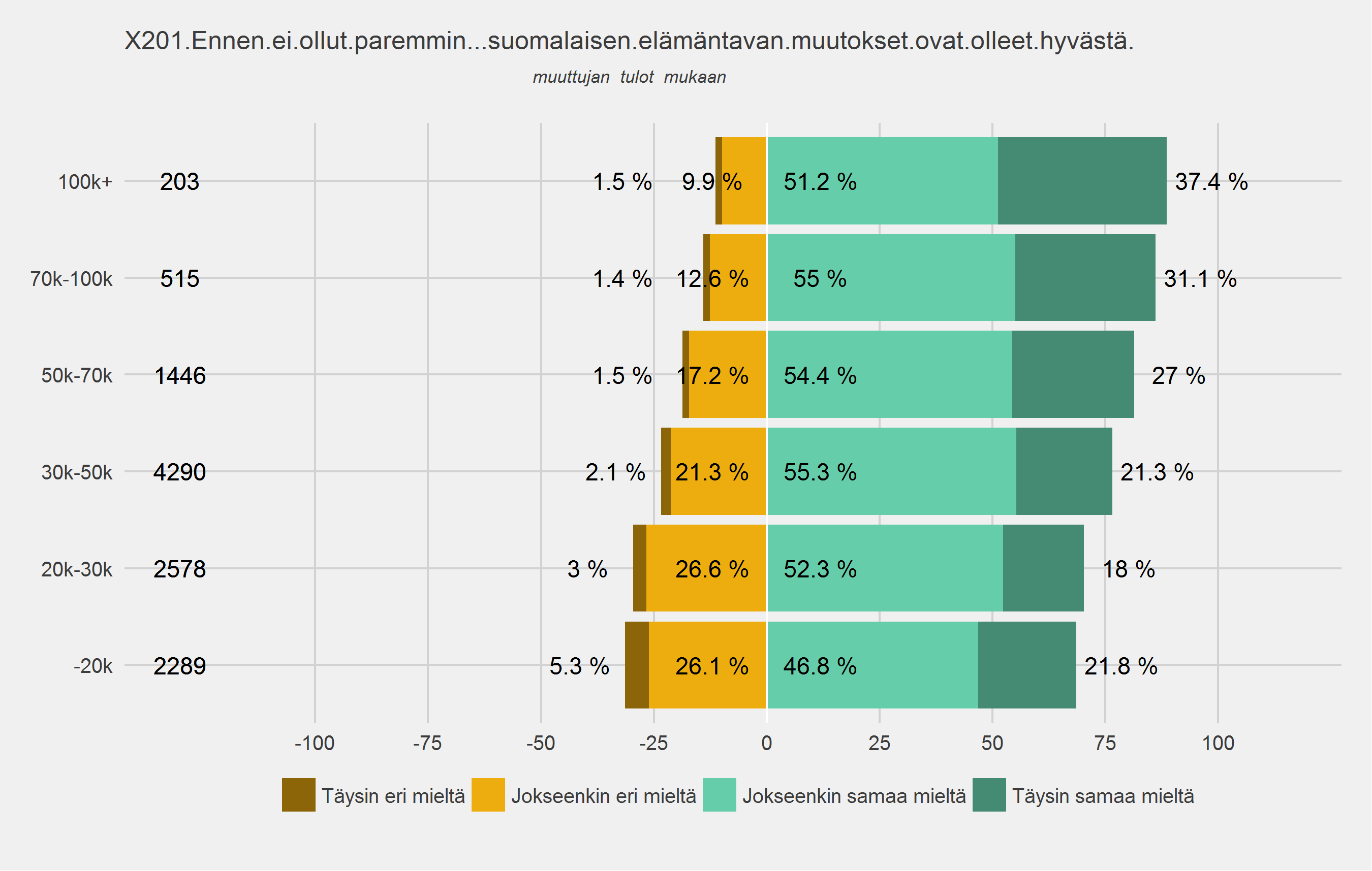 Suurimmat erot ovat kysymyksissä 1 ja 6 (ennen ei ollut paremmin ja yhtäläiset mahdollisuudet), joissa ehdokkaiden vastaukset asettuivat suoraan tulojärjestykseen. Suurempien tulojen ehdokkaat kaipaavat vähemmän entiseen ja ovat paljon enemmän (tämän vertailun suurin ero, yli 30 %-yksikköä) sitä mieltä että Suomessa kaikilla on yhtäläiset mahdollisuudet. Jälkimmäinen havainto tukee tutkimustuloksia ulkomailta, missä rikkaammat tyypillisesti eivät osaa nähdä köyhien lailla niitä rakenteellisia ongelmia joiden takia kaikilla ei ole samanlaisia mahdollisuuksia elämässään.