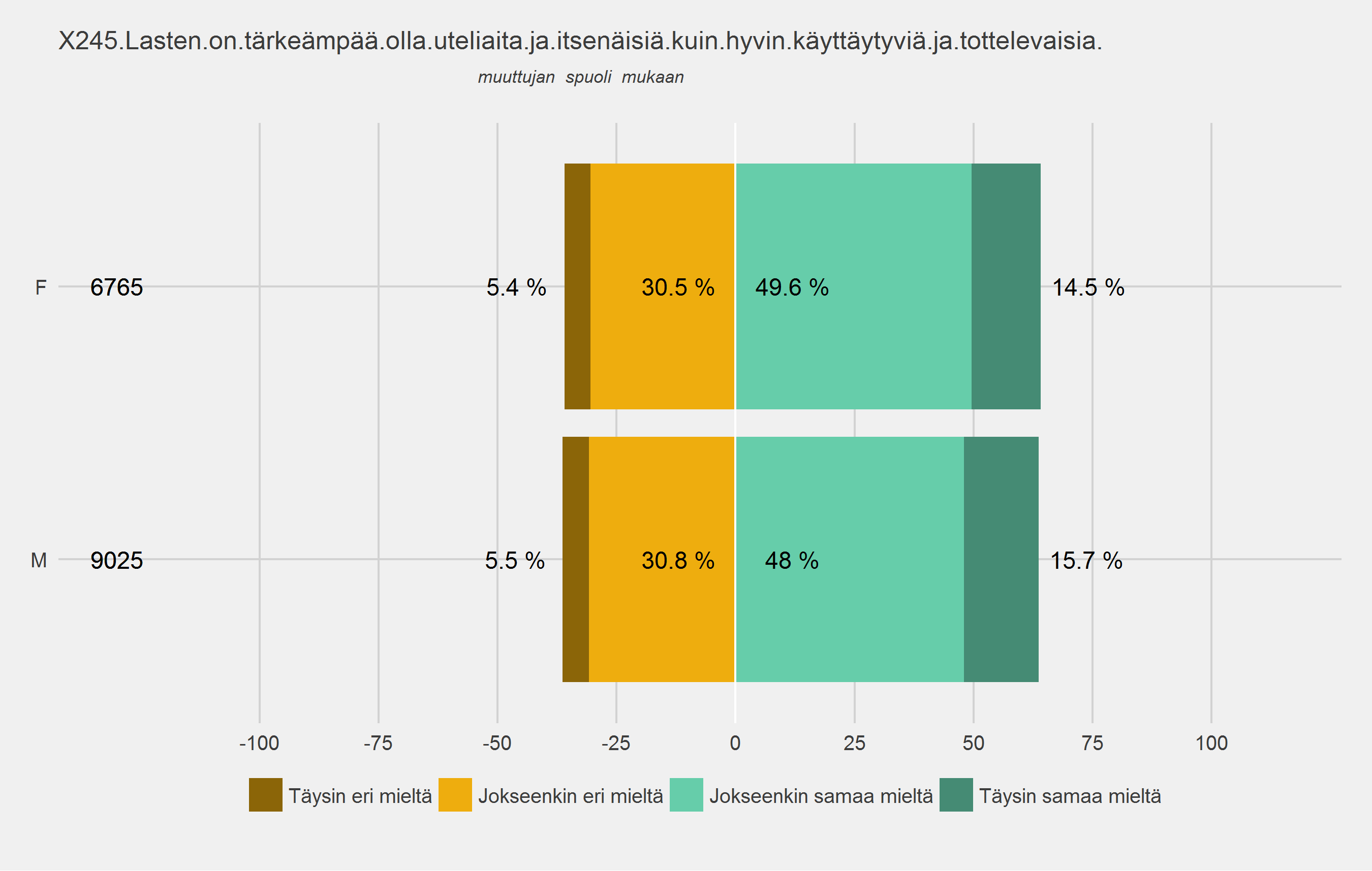 Jatkoa edelliseen vertailuun. Data on sama, arvokysymykset ovat samat, skriptit kirjoitin osin uusiksi jotta sain vertailuun puolueiden sijaan taustamuuttujat: sukupuoli, ikä, koulutus, tulot, kuntatyyppi, poliittinen kokemus, uskonto ja työnantajatyyppi (ks. tarkemmat luokittelut alhaalla). En käy kaikkia läpi, koska 6 arvokysymystä * 8 taustamuuttujaa on vähän liikaa, mutta nostan esiin muutamia kiinnostavia havaintoja. Liitän mukaan kaikki kuvat, niin voitte itse katsella niitä kuvia joita en ole käsitellyt.