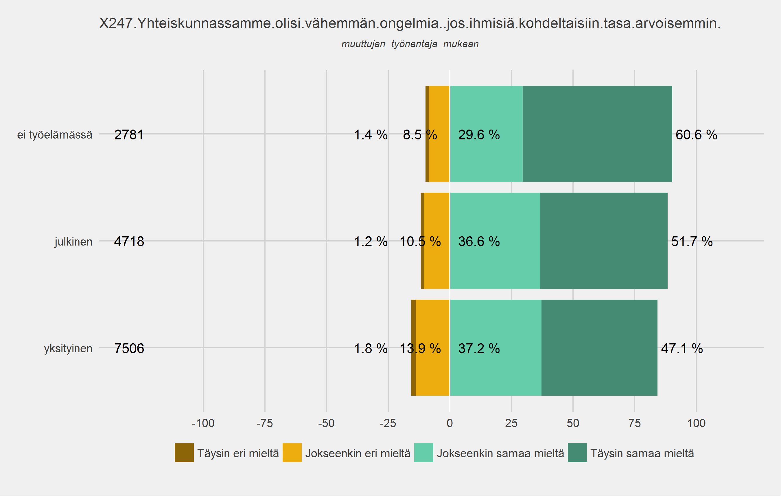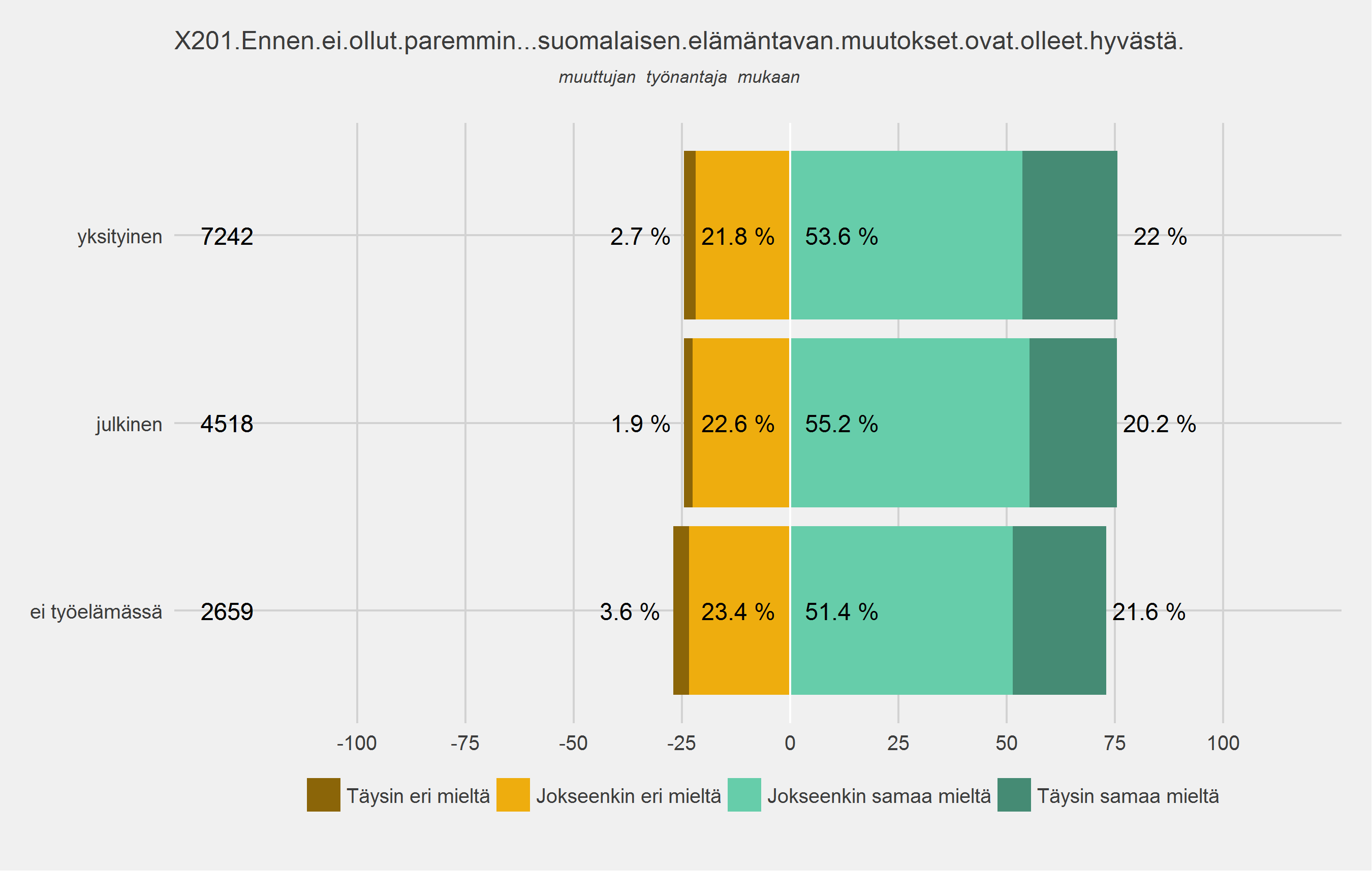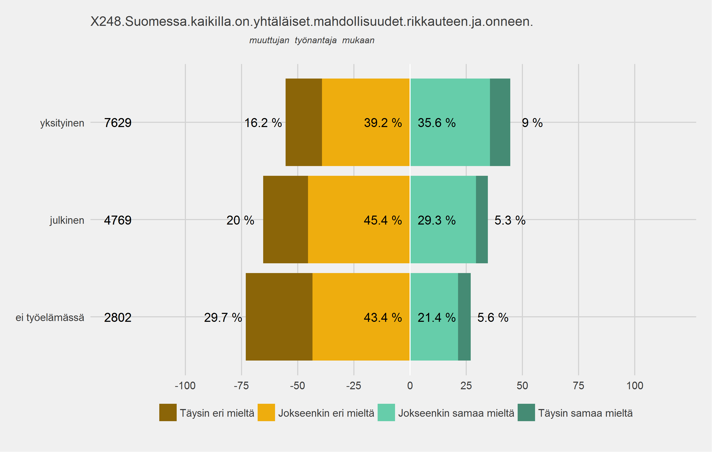 Työnantajalla – julkinen, yksityinen, vai ei töissä – oli merkitystä erityisesti vahvan johtajuuden ja yhtäläisten mahdollisuuksien kohdalla. Työttömät ehdokkaat ovat ymmärrettävästi harvimmin sitä mieltä, että kaikilla olisi samat mahdollisuudet, yksityisten ollessa enemmän samaa mieltä (julkinen näiden välissä). Yksityisen sektorin työntekijöiden mielestä myös vahva johtajuus on enemmän tarpeen verrattuna julkisen sektorin työntekijöihin (työttömät näiden välissä). Elämän kilpailullisuudessa vain julkisen puolen työntekijäehdokkaat ovat enemmän eri mieltä kuin samaa mieltä, työttömät ja yksityiset hieman enemmän samaa mieltä (tosin ero on pieni).