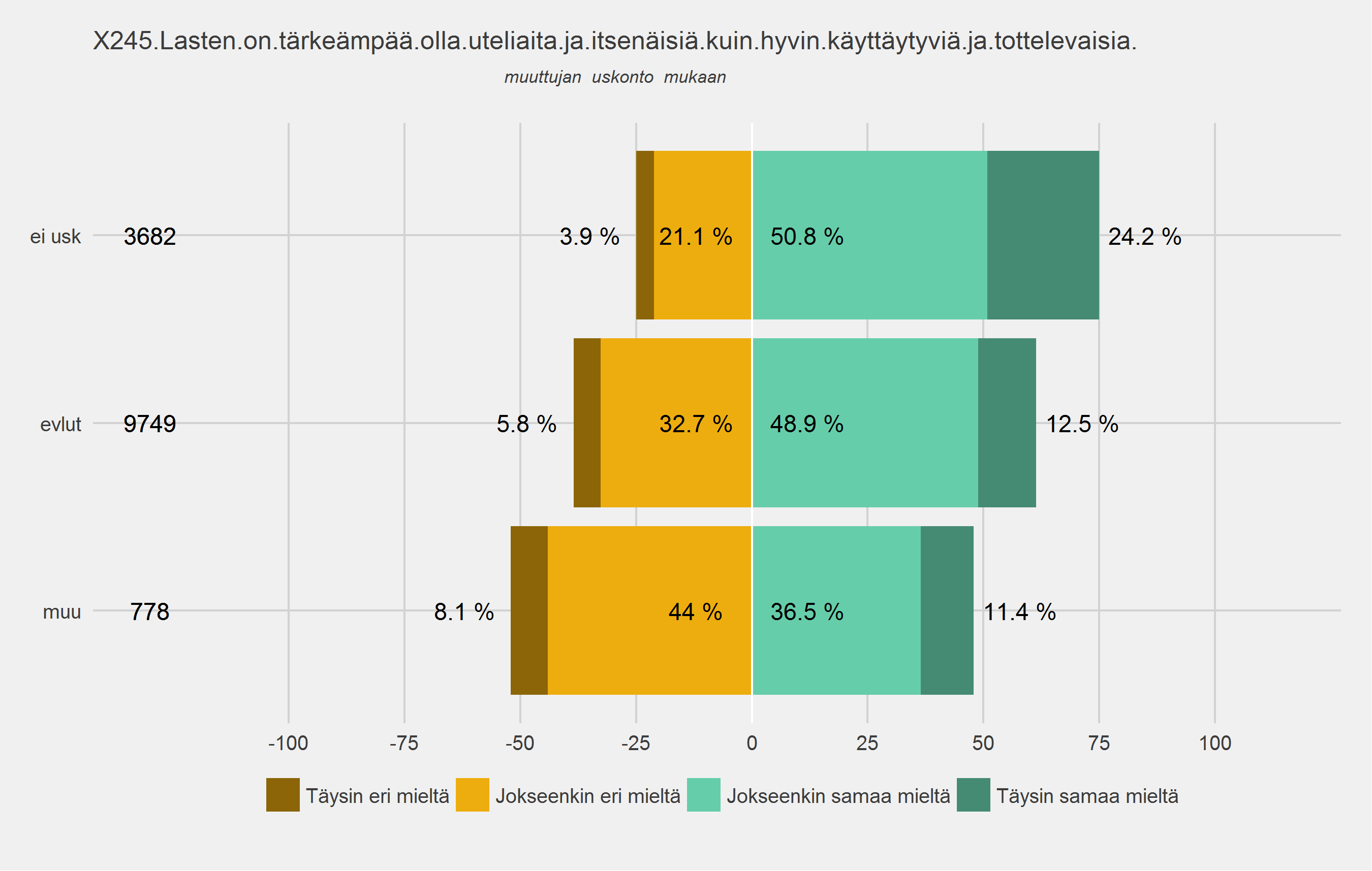 Suurin ero uskonnon suhteen on kuitenkin lasten ominaisuuksien kohdalla, mikä onkin tutkimuskirjallisuudessa ollut yhteydessä konservatiiviseen sovinnaisuuteen sekä populistisiin liikkeisiin. Uskonnottomien mielestä lasten on tärkeämpää olla uteliaita ja itsenäisiä, evankelisluterilaisten mielestä vähemmän, ja muiden mielestä hyvä käytös ja tottelevaisuus ovat useammin tärkeämpiä. Myös yhtäläisten mahdollisuuksien suhteen on eroa: uskonnottomat ovat eniten eri mieltä.